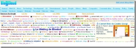 Dans la série annuaire, mais sous forme de nuage de tags, voici venu BlogTag, une autre initiative recente, qui propose de regrouper les blogs d’une manière originale. A chaque fois qu’un utilisateur se rend sur le nuage depuis un blog le tag de se dernier devient plus gros. Très bonne idée.