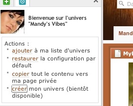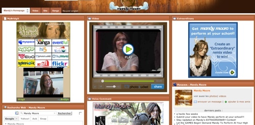 La première chose ? laquelle on pense c’est MySpace, cette page ressemble au célèbre réseau social (160 millions d’utilisateurs). Peut être en plus beau… mais on y trouve les mêmes caractéristiques, beaucoup d’infos sur le/la propriétaire de la page. A l’heure actuelle aucune info sur les ambitions sociales de la start up française. La grosse différence avec MySpace est quand même qu’aucun contenu n’est généré via Netvibes, en fait il s’agit d’une aggrégation de plateformes, sur le Univers de Mandy on trouve un onglet consacré ? Xanga, un autre réseau.