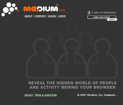 me.dium propose de connaitre ce que font les « autres » sur internet. J’avoue que la tagline ne m’a pas particulièrement inspiré au départ, mais la curiosité a été la plus forte, en anglais dans le texte ; « reveal the hidden world of people and activity behind your browser ».
