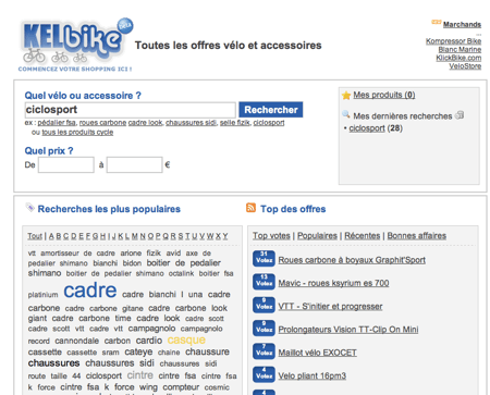Kelbike permet donc de comparer les prix, trouver du matériel ? partir d’une seule et même interface. Plus besoin de courrir tous les marchants du web, il suffit de faire une recherche sur le site, naviguer via le nuage de mots clés ou d’utiliser le digg-like pour trouver les bonnes affaires du net.