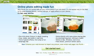 Picnik – éditeur photo en ligne avec fonction import depuis d’autres sites de partage d’images et quelques fonctionnalités avancées.