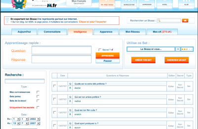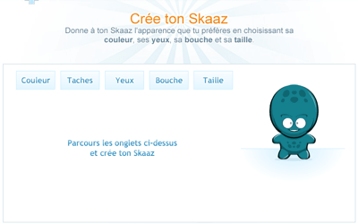 Tout le site repose donc sur votre Skaaz, cet avatar que vous composez simplement (couleur, yeux, bouche, proportion) et ? qui vous commencez ? apprendre ? répondre aux questions. Une série de base est proposée mais vous avez tout loisir de lui apprendre des milliers de réponses si le coeur vous en dis. Dans le cas où quelqu’un lui poserait une question dont il ne connait pas la réponse lors de votre prochaine connexion au service il vous sera possible de la rajouter.