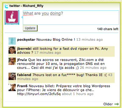Salut Richard, je suis pas trop d’accord avec ce que tu dis ? la fin. Car il était déj? possible d’utiliser twitter sur n’importe quel téléphone (qui accepte l’installation d’applications). Webwag n’a pas été le premier ? proposer une intéraction avec Twitter. On peut nommer Fring par exemple qui permettait déj? cela. Mais c’est vrai que la façon de Webwag de le faire est très très pratique. Bravo ? eux.