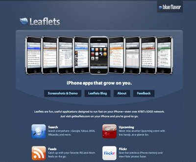 Je viens de jeter un coup d’oeil sur Leaflets un service dédié ? l’iPhone qui propse une suite logicielle en ligne pour le dernier « jouet » made in Apple. Leaflets est donc accessible en ligne et propose plusieurs applications que chaque power user du web pourra apprécier. Regroupé au sein du service on trouve un lecteur de flux RSS, un outil de recherche, l’accès aux photos flickR, aux liens del.ico.us, un répertoire d’applis pour iPhone et quelques partenaires comme notre très national Tour de France ainsi qu’un accès au New York Times. Evidement le site fait la promesse d’ajouter beaucoup de chose d’ici peu de temps.