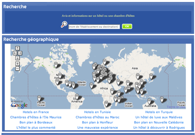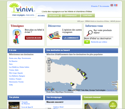 Salut Richard, merci pour ce post. J’en profite pour rajouter que vinivi propose deux fonctionnalités encore plus web 2.0 🙂 . les hotels les plus demandés sont placés ? la main sur une carte, ce qui permet de voir si le descriptif du site web ou le réceptionniste ne raconte pas trop de bétises en vous promettant une chambre vue mer alors que manifestement il y a un 500 mètres devant la terrasse, . outre les photos vous pouvez envoyer des vidéos des hotels. Vinivi dépasse la rédaction d’avis pour le spectre total du « multimedia. ». Ca déchire 🙂 Enfin j’dis ça, j’dis rien.