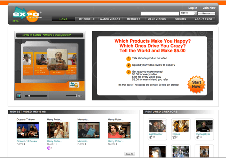 Expo Television est un site de Time Warner qui a déj? levé 6 millions de $ en décembre dernier, le principe est simple, vous vous filmez en donnant votre point de vue sur un produit/film/… le site vous paye 5$ par vidéo créée et 0,01$ par visionnage.
