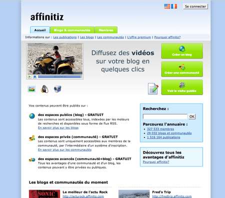 Affinitiz est un start up française active depuis maintenant 7 ans qui compte pas loin de 330 000 membres. Il s’agit d’une plateforme de réseaux sociaux qui permet ? chacun de créer et gérer une communauté. La création d’un compte est gratuite, rapide et permet de mettre en oeuvre 2 des outils clés du web2.0, un blog et un réseau social.