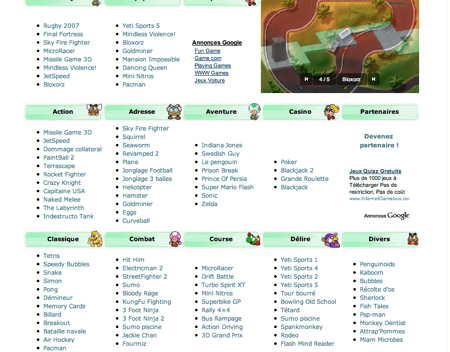 Jeux-fun est « simplement » une page qui regroupe des centaines de jeux en flash gratuit, ils sont classés par genre, un petit texte d’explication en français pour les allergiques ? la langue de Paris Hilton et il ne vous reste plus qu’? perdre quelques heures pour trouver les perles du genre.
