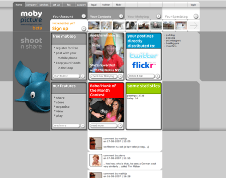Mobypicture est une société basée ? Amsterdam qui propose une solution de photoblogging depuis votre téléphone mobile. Le fonctionnement est simple, vous prenez une photo avec votre mobile et vous l’envoyez au site soit pas MMS soit par email, quelques minutes elle est en ligne dans votre « mobylog ».