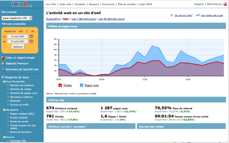 J’avoue que j’ai installé un paquet d’outil de stats ici dont sitemeter et Google Analytics mais celui que je regarde et surveille au quotidien (oui oui c’est un truc chez beaucoup de bloggueurs nous sommes malades de stats) c’est iMinR.