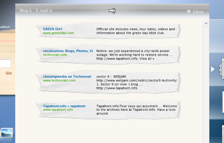 En bas ? droite de l’écran, il est possible de jongler dans les différents « type » de recherches : web, images, rss, news, livres. La navigation est très rapide et le rendu graphique ? la hauteur.
