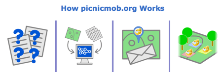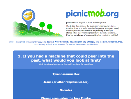 Picnicmob est un site américain qui propose une approche ludique des flashmods/rencontres entre inconnus. Le fonctionnement est simple, une série de questions décalés (30 pour être précis), ensuite un peu de géolocalisation avec le jardin public le plus proche de chez vous, enfin dès que le nombre de participant est atteint (100 pour être précis), tout le monde se retrouve autour d’un picnic le dimanche après midi.
