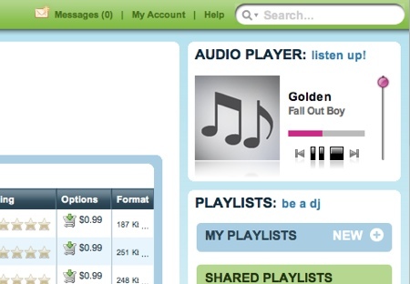 Le site est plutôt joli et agréable, du bleu et du vert, des reflets, très clean. Le contenu est une sorte de mix de ce que l’on connait déj? . A un premier niveau, il s’agit d’un moteur de recherche de titres musicaux qu’il est possible d’écouter en streaming dans un joli player. A un second niveau il y a un réseau social avec fiche profil et liste d’amis.