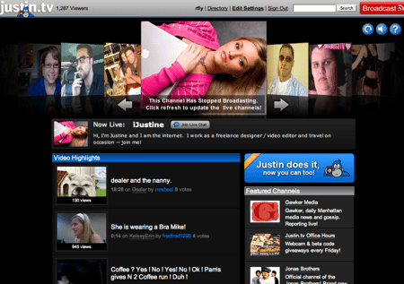 Justin.tv n’est pas un site de video sharing classique car sa principale caractéristique est de permettre la diffusion en direct depuis n’importe quelle machine équipée d’une webcam et de la dernière version de Flash.
