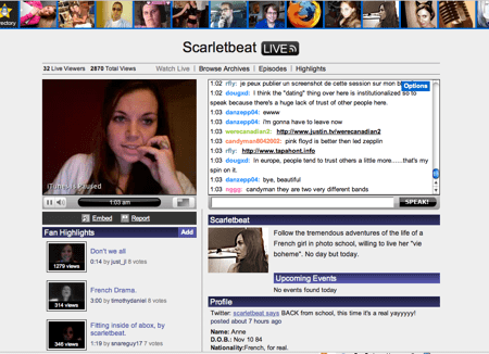 Mis ? part cela, la réalisation est bonne, tout y est : plein écran (qualité mauvaise), profil, chat et même une balise embed pour intégrer son show live dans son blog/site. Les sessions ne sont pas sauvegardées mais il est possible d’enregistrer des épisodes et de les programmer.