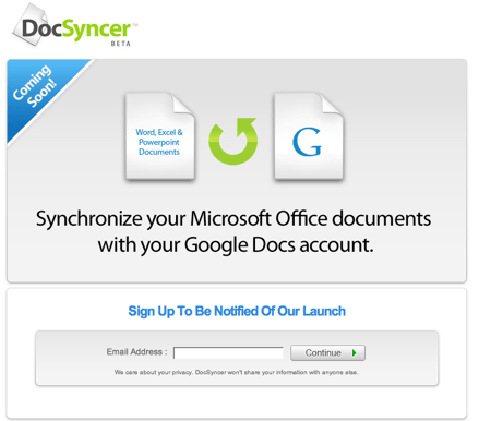 Je sais c’est pas sympa de faire de fausses joies aux utilisateurs qui aiment ces foutus docs, tableurs & co car DocSyncer est encore en BETA fermée. Ceci dit l’idée est bonne proposer un service qui synchronise vos documents en local édité via la suite Office de Microsoft avec la suite en ligne de Google.