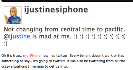 Le buzz fonctionne, tout le monde parle de business, de milliards de dollars, d’enjeux même du futur mais LA vrai news de la semaine est tombé y a 2 jours et aucun blog n’a relayé cette info cruciale, celle qui fait vibrer le web, je vous l’annonce au cas où, ça y est Justine a Twitter sur son iPhone !