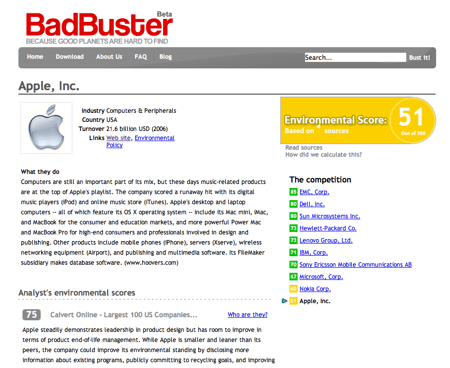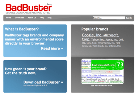 BadBuster est un tout jeune site internet qui s’est fixé une mission : noter les qualités écologiques des entreprises. Le site est en anglais et ne regroupe pour l’instant que des entreprises américaines. L’idée est d’aggréger toutes les sources disponibles sans distinction et de réussir ? convertir ces données en une note sur 100. Plus la note est haute meilleure est la société.