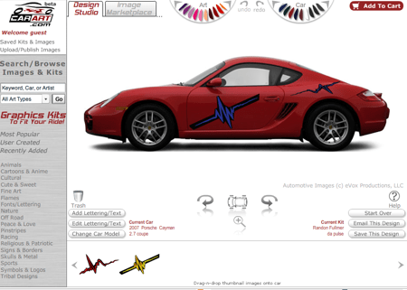 L’idée de CarArt est de proposer aux utilisateurs de personnaliser leur voiture ? l’aide d’autocollant spécialement prévus pour cet usage. Pour décorer votre voiture vous devez bien sûr par choisir le modèle – il s’agit d’un site US ne cherchez donc pas les marques françaises – et de lancer le « studio de design ». Il s’agit en fait d’un appli en flash qui fait apparaitre le véhicule sous toutes ses coutures, ? vous de le transformer.