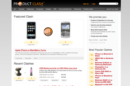 Product Clash est un site marrant sans vraiment grand intérêt mais marrant. Le principe, des produits hightech sont proposés aux utilisateurs enregistrés (pas terrible pour lancer un site ça…) et ils votent pour celui qu’ils préfèrent.