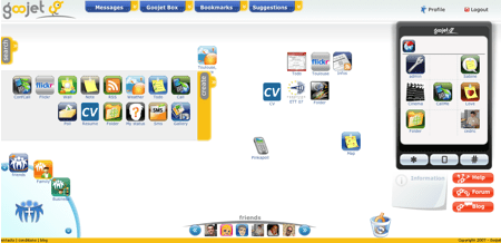 Goojet offre une interface soignée, la version en ligne est claire et ? la différence des concurrents on sent vraiment que l’idée est de pousser l’internet dans le mobile plus que synchroniser le web et le web mobile. L’ajout de module se fait par drag n’drop de manière simple.