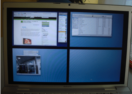 Mon premier plaisir a été d’activer les « spaces », j’avais bien aimé les bureaux virtuels dans les distrib de Linux que j’ai pu voir et l’idée de pouvoir mettre ailleurs plutôt que dans le doc certaines applis me branchait bien. J’ai une machine puissante donc le test n’est pas vraiment neutre mais c’est très fluide, j’ai essayé de le faire planter en lançant 2 vidéos (vlc + quicktime), firefox, un tchat par skype et Photoshop, tout c’est bien passé.