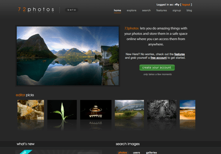 72photos est un site de partage comme il est en existe beaucoup, mais quand je suis tombé sur la homepage j’ai trouvé ça beau. J’avais envie de me balader, je tester les effets promis par la catégorie « features » mais malheureusement rien n’a fonctionné… 2 tentatives pour créer mon compte et une fois cela fait impossible d’uploader la moindre image (test depuis ma machine et depuis FlickR).