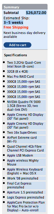 Pour 2 799$ vous aurez droit ? 2 quadcore Xeon ? 2,8Ghz, 2 Go de RAM et un disque dur de 320 Go.