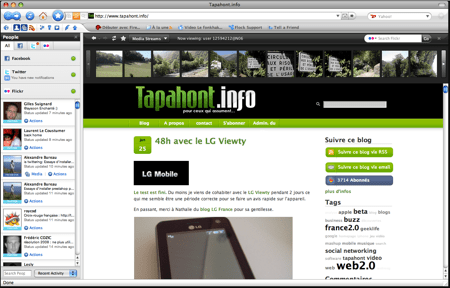Concrètement, une fois configuré il est possible de retrouver dans une barre verticale l’activité de son réseau sur les sites choisis, d’envoyer et de consulter des photos de FlickR, de balancer un message sur Twitter… Vu comme ça, on peut penser que c’est un outil de Geeks mais c’est typiquement ce genre de logiciel qui peut permettre au plus grand nombre d’utiliser certains sites en les rendant plus accessibles. Bon ok, faut configurer le bidule, mais ça reste ? la portée du surfer moyen.