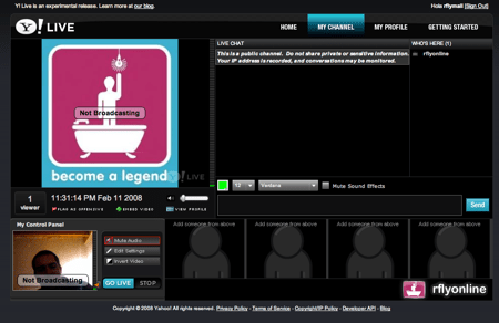 Y!live est donc une plateforme qui permet de faire facilement et rapidement sa télé sur le web. Le site utilise flash et via une webcam + un micro permet ? n’importe qui de diffuser du contenu en ligne.