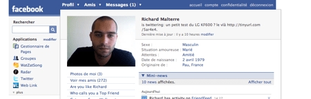 Pour ma comparaison avec Ziki, je pensais surtout ? la possibilité de recevoir par RSS et/ou mail tout le contenu d’un profil, ce qui revient un peu ? la même chose, twitter en moins… Le web2.0 apporte aussi une couche technologique ? des choses que l’on a connu, un réseau social n’est pas si loin que ça de nos bons vieux forums, et Twitter pourrait dans sa version online est comparé ? nos anciens channels IRC. Sur la partie exhibition, je suis un peu moins inquiet que toi Lekid, après c’est ? chacun de comprendre qu’il ne doit pas faire en ligne ce qu’il ne ferait pas dans sa vie de tous les jours. De plus si on reste dans la « sphère hitech » nous cherchons de la visibilité et ce sont de bons outils pour cela. Pour la parenthèse friendfeed, moi je l’ai ajouté ? mon facebook car il est très bien intégré et du coup c’est vrai que les infos remontent bien.