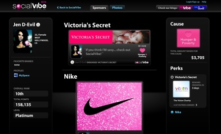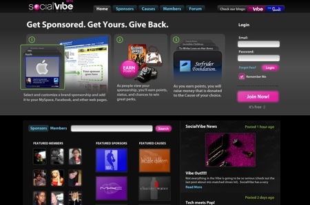 SocialVibe est donc encore un site basé sur la création d’un page profil, mais ici l’idée n’est pas de se faire des amis mais de l’argent. En réalité la page profil est réduite au minimum, une photos, 2 lignes de texte, le lien vers votre site/MySpace/Blog/… et surtout les sponsors et bonnes causes que l’utilisateur a choisi.