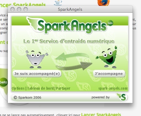 Cette semaine, la version pro est disponible pour tout le monde et permet de monétiser son expertise, sa compétence en proposant un mode de rémunération basé sur le temps. Pour faire simple, Sparkangel offre un widget ? placer sur son blog/site qui affiche la disponibilité de l’interlocuteur, le désormais client peut solliciter un entretiens et une fois l’application lancée paiera la prestation ? la minute. Par l’intermédiaire de SparkAngels il est possible de partager les écrans, prendre la main sur la machine (pour installer une imprimante sous Vista par ex – oui c’est du vécu) ou simplement engager une conversation audio plus classique. A noter que la visioconférence est prévue dans les semaines qui arrivent.