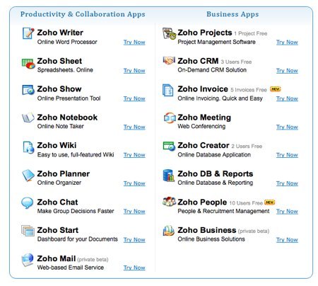 Zoho est une société dont je parle presque jamais peut être parce que Benoit le fait très bien. Zoho est un site qui propose une très longue liste d’application en ligne qui se placent en confrontation directe avec les solutions de Microsoft Office, Google et de beaucoup de progiciels.