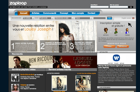 L’idée de Zaploop repose sur sa tagline : « qui mieux que les fans pour vendre la musique », zaploop propose donc ? ses utilisateurs de créer des playlists piochées dans le catalogue disponible et de les partager sur leur blogs/sites/pages MySpace. Dans le player en flash généré il est possible d’écouter les titres en entier mais aussi et surtout de les acheter en 1 clic, chaque vente est partagée entre l’artiste, le site et le vendeur (25%). En gros, zaploop c’est un peu le disquaire 2.0.