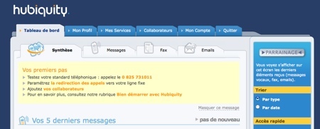 Pour faire simple, une fois inscrit sur hubiquity vous disposerez d’un numéro en 0 825 pour votre société et de numéros en 09 pour vos collaborateurs, tous ces numéros sont administrable depuis une interface en ligne et peuvent être renvoyé vers des téléphones fixes ou des mobiles. L’intérêt, 1 numéro sur la carte de visite qui envoie sur un téléphone fixe/mobile + fax + boite mail + répondeur personnalisé et tout ça accessible dans votre navigateur.A noter aussi j’avais aussi bien aimé la simplicité de prise en main de l’interface.