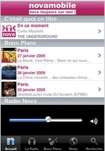 Tout ça pour dire que j’ai vu ? l’instant sur iphon.fr l’annonce de la sortie de Radio Nova l’application. Au menu donc le streaming de la radio, le nom du titre qui passe avec son lien iTunes pour l’acheter (et ça si vous écoutez Nova c’est cool), des news et les bons plans de Nova.