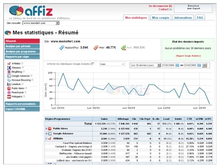 Les ptits gars d’Affiz ont donc réalisé un tableau de bord supportant la plupart des régies ainsi que les statistiques provenant de Google Analytics afin de pouvoir suivre heure par heure l’évolution des revenus générés.