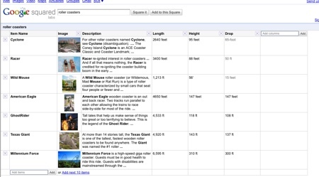 Le principe est comme souvent avec Google assez limpide, Google squared indexe des tableaux qui regroupent des listes, des collections d’information organisées sous forme de tableaux. Sous le module de recherche vous pouvez trouver des exemples comme ce comparatifs de montagnes russes 🙂