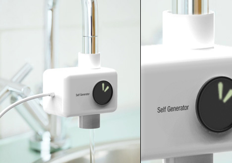 Une idée géniale que j’avais trouvé je ne sais plus où (mon avis Yanko 😀 ) qui si un jour arrive dans nos vies pourrait changer au moins notre consommation d’énergie pour nos mobiles. Le concept réside dans un mini centrale hydro-électrique qui viendrait se cacher sur un robinet pour alimenter un prise électrique, le concept en image :