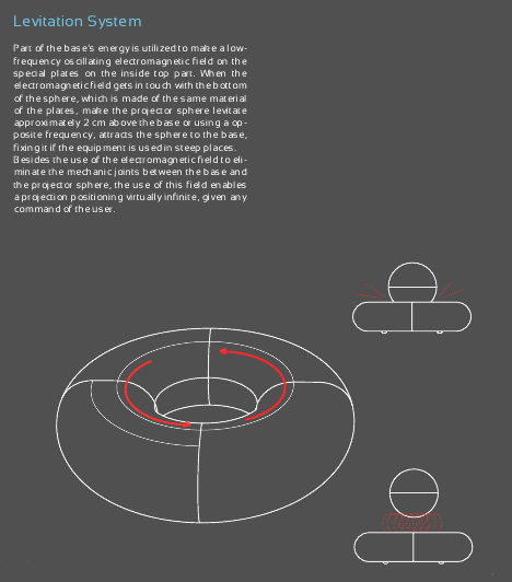 C’est un retroprojecteur du futur, l’idée est de faire flotter le projecteur grâce ? un champs electro-magnétique et du coup de pouvoir l’orienter de la manière que l’on désire avec une précision diabolique. Comme c’est un concept, ils ont ajouté une batterie du futur, toutes les ports possibles avec connexion HDD, SD….
