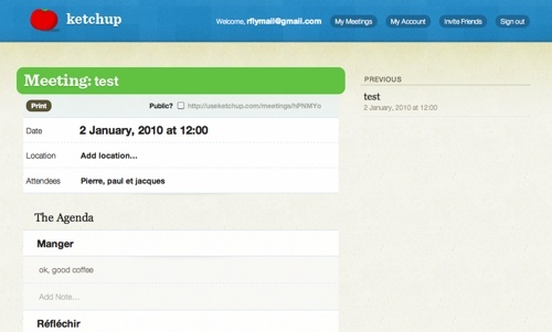 Ketchup a des gros défauts mais je trouve intéressant cette approche minimaliste, le service va devoir énormément évoluer pour espérer rencontrer sa cible et peut être faire payer un jour des comptes pros. J’ai la chance de ne faire qu’un nombre raisonnable de réunion et j’utilise pour ma part Evernote pour ce genre de tâches, mais peut être qu’il y a une vraie demande sur ce thème.