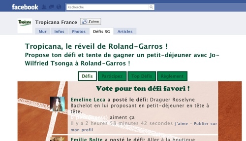 Si Tropicana n’avait pas été très présent sur les nouveaux médias, cette année la décision a été prise de jouer à fond la carte du participatif pour donner « un coup de pouce Vitalité aux acteurs de Roland-Garros pour faire du tournoi 2010 une édition exceptionnelle… » Le dispositif est simple, le point de départ est la toute nouvelle page de Tropicana sur Facebook sur laquelle vous pouvez vous inscrire, retrouver des contenus produits spécialement et surtout un module « Défis RG » qui va permettre de gagner un petit déj avec Jo-Wilfried Tsonga à Roland-Garros.