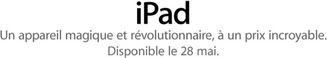 iPad Wifi 16Go : 499€ iPad Wifi 32Go : 599€ iPad Wifi 64Go : 699€ iPad 3G 16Go : 599€ iPad 3G 32Go : 699€ iPad 3G 64Go : 799€