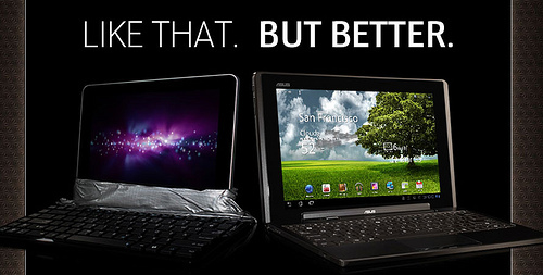 Asus a en plus choisi une stratégie de communication assez amusante avec d’abord une parodie de The Big Bang Theory et il y a quelques jours un montage avec un iPad scotcher à un clavier.