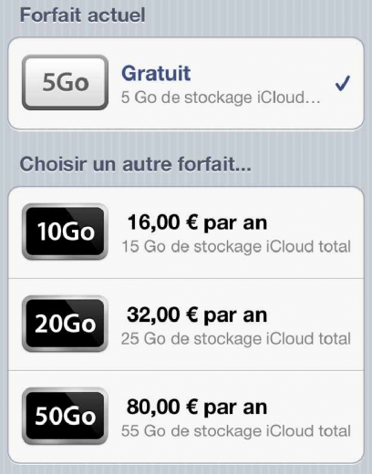 De son côté Apple a annoncé les prix de son service de Cloud, au nom presque énigmatique de iCloud. Les prix semblent correct sachant que les apps, la musique achetée dans iTunes, la sauvegarde et synchro du calendrier et du carnet d’adresses ne rentrent pas en ligne de compte. Une bonne nouvelle, c’est qu’Apple semble avoir réalisé que les monnaies disposent d’un système de change et donc que 1$ n’est pas égal à 1€.