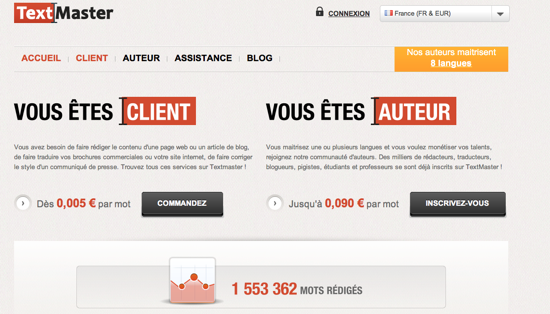 Je me suis inscrit sur textmaster , et je trouve formidable ! j’ai fait plusieurs commandes et je suis trop satisfait.