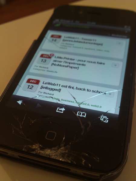 Mais en début de semaine, c’est arrivé, mon iPhone4 de Août 2010 recevait un coup difficile à encaisser et le résultat a été sans appel :