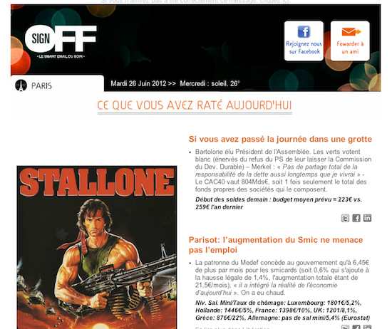 TimeToSignOff fonctionne sur un principe d’une simplicité déconcertante. Tous les jours, en fin d’après midi, vers 19h, l’utilisateur inscrit reçoit un mail avec un condensé d’actualité. Il s’agit ici d’actualité « générale », de celle qui permet d’avoir l’air au courant dans les diners en ville et avec une grosse mémoire de pouvoir tenir le coup dans question pour un champion.