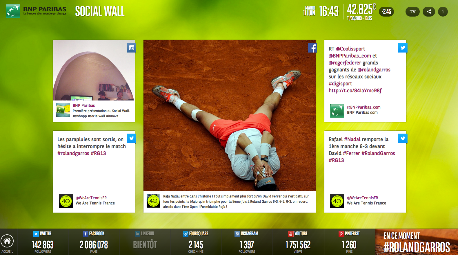 L'idée était donc de créer une web app qui agrègerait les contenus en provenance de Twitter, Pinterest, Facebook, YouTube, instagram mais aussi de topics sur Twitter via un # comme c'est le cas actuellement pour Roland Garros.